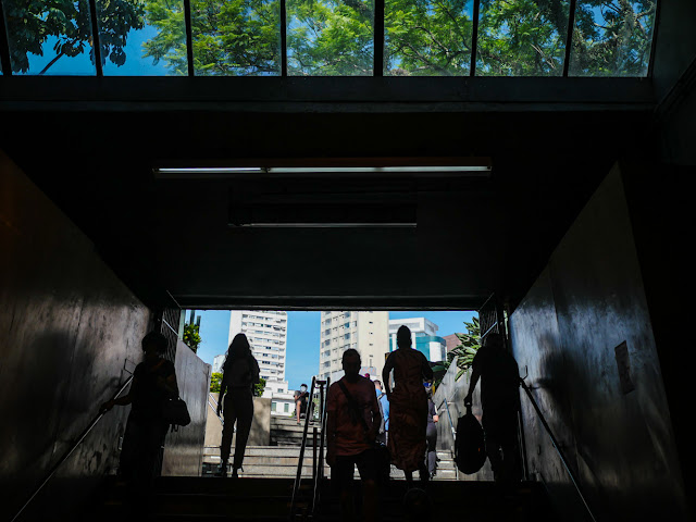 Nos encontramos na estação Paraíso do metrô e saímos para fotografar rumo à Avenida Paulista. Éramos oito às 8 horas. No grupo, um fortinho já queria pão com cafezinho! No caminho, Carlos e eu fazíamos umas fotos da Avenida 23 de Maio, lá no viaduto, bem no alto, quando escutamos uma voz em sobressalto: "be careful with your cameras!" A pessoa seguiu seu passo. Seria um anjo de outro país a nos avisar do perigo iminente? Seria caso de pedir ajuda a um tenente? A polícia passava a todo instante! A cidade é perigosa, desgastante e também vibrante! Encontramos nossa benfeitora aguardando a travessia logo adiante! Ficou surpresa ao saber que éramos daqui! Nosso grupo estava ali! Câmeras e lentes em ação! O Zé com sua lente em forma de canhão! Agradecemos a gentileza e atenção! Que bênção! Precisamos de proteção! Viva!!!
